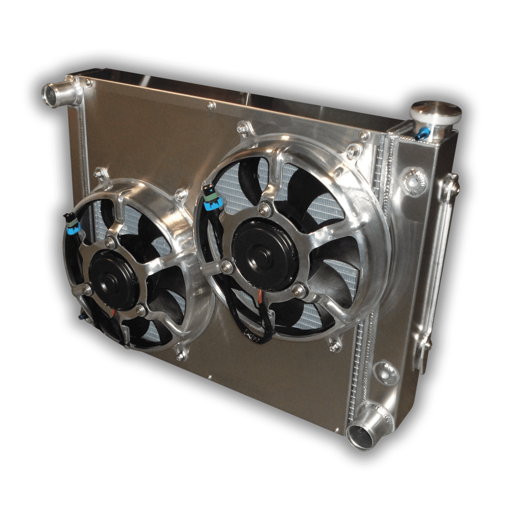 Like all of our radiators, it’s made with pride in the USA with USA made cores. Unlike most radiators, our cores are purpose built for high performance cooling and are not made using standard passenger car (PC) cores. All of our radiators are fully TIG welded, 2-rows of 1.0″ tubes, use heavy duty transmission coolers, no epoxy, a billet filler neck, brass overflow connections and a brass drain cock.